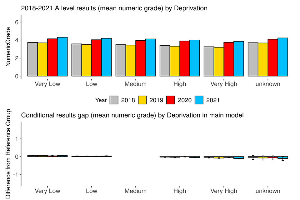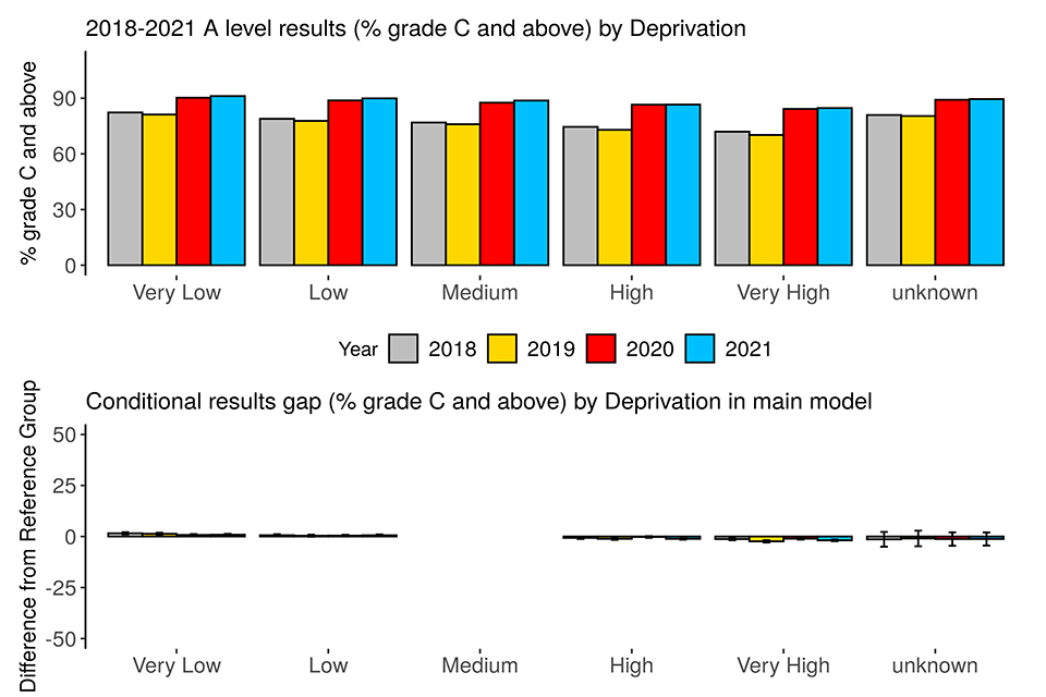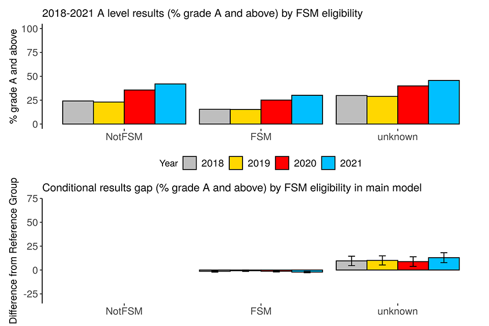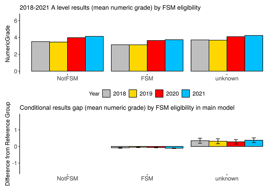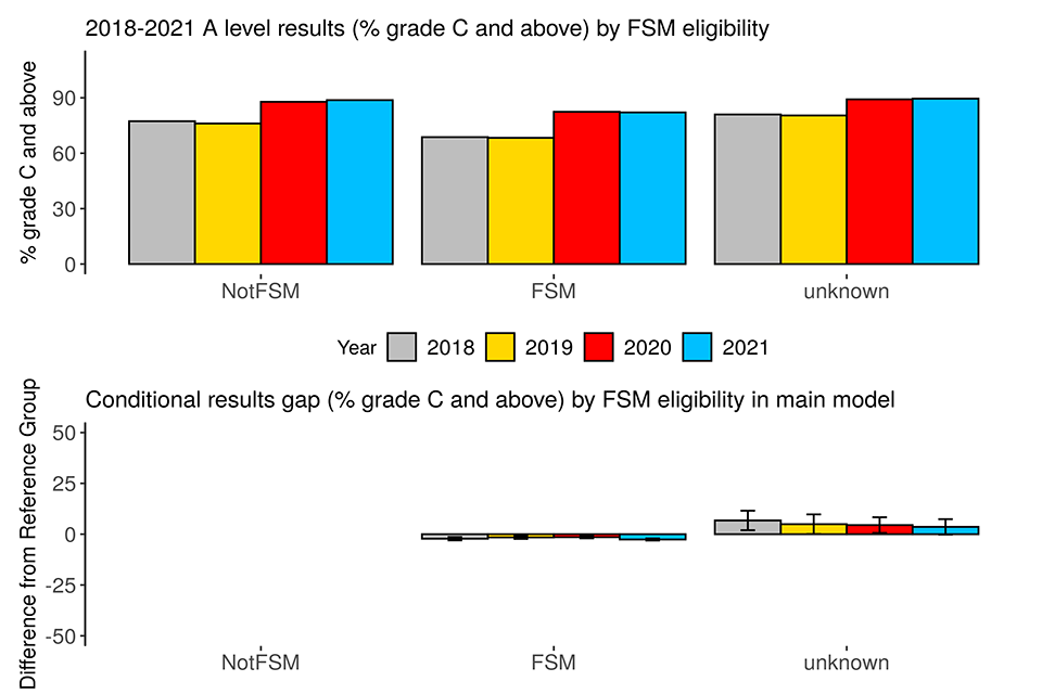 Candidates with unknown ethnicity, candidates with unknown FSM status, and candidates in tertiary colleges, have seen, in the same period, an increase in outcomes relative to prior-attainment-matched candidates of their respective reference group.
