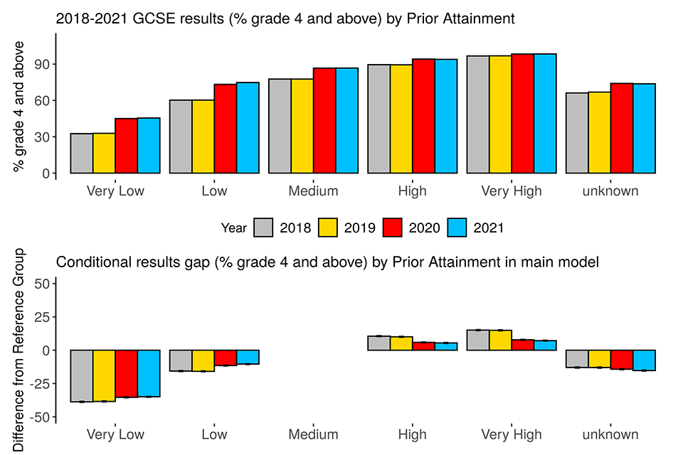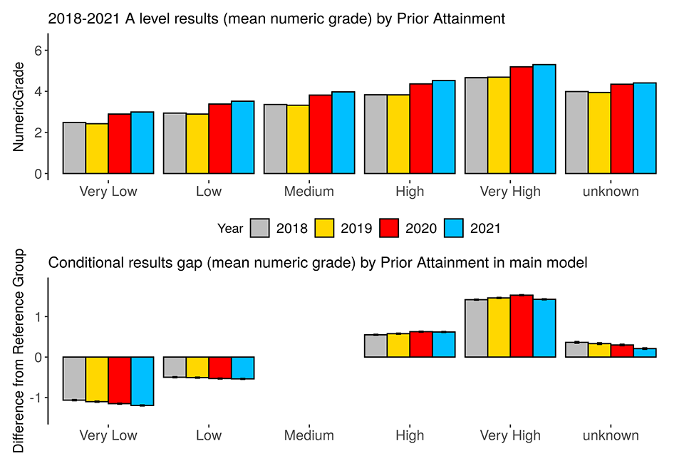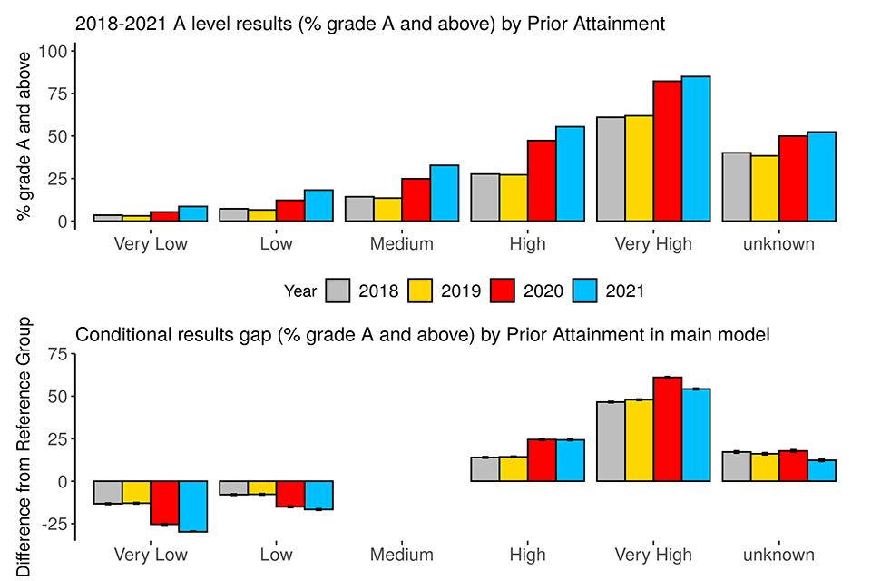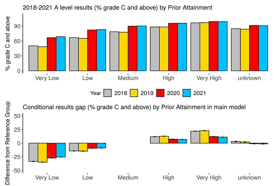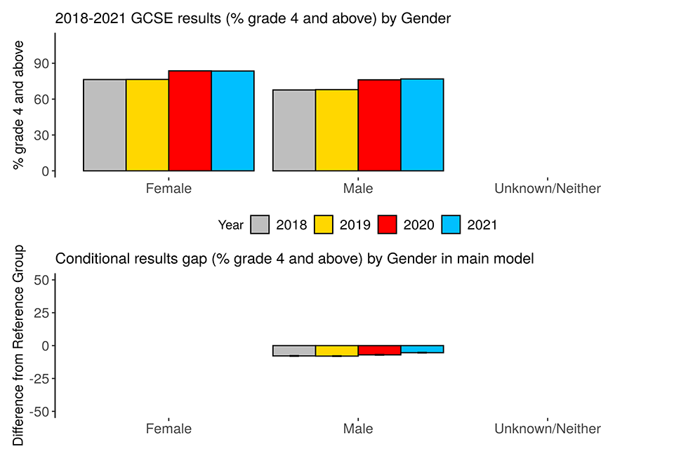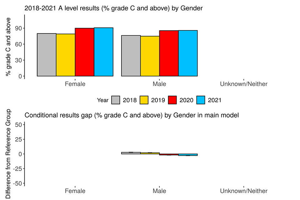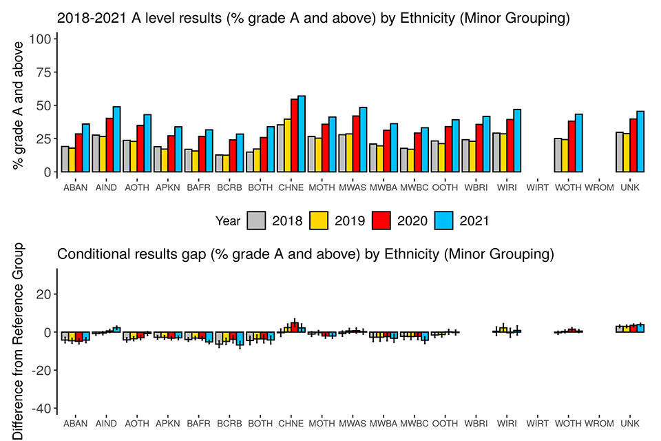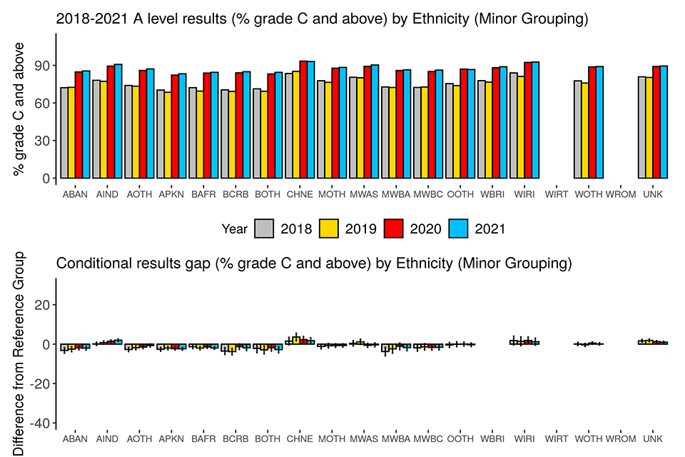 - the gap indicating higher outcomes of candidates with unknown ethnicity relative to prior-attainment-matched White British candidates has widened by 3.85 percentage points