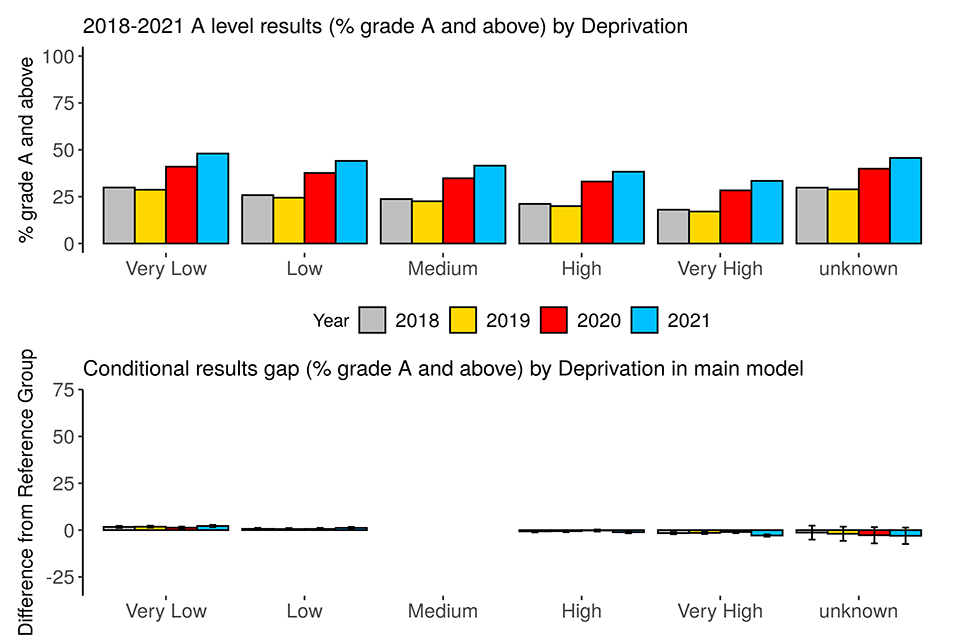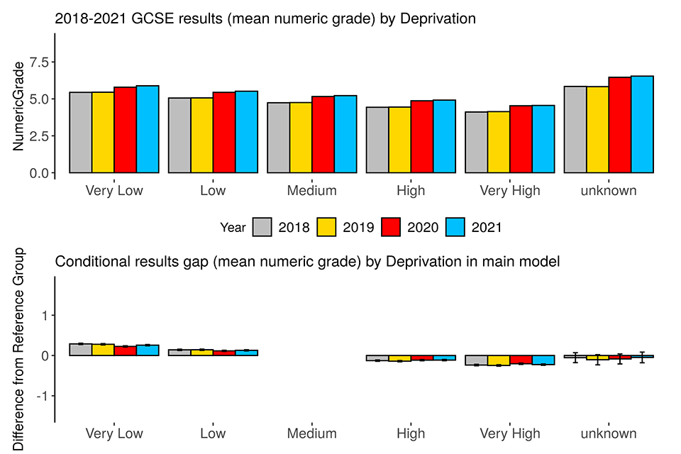 This paper presents an analysis of how differences in results between groups in summer 2021 compare to those in results of summer 2018 to 2020. The grouping variables included in our analysis were gender, ethnicity, major language, special educational needs and disabilities (SEND), free school meal (FSM) eligibility, deprivation, prior attainment, centre type and region. We analysed 3 results measures: mean numeric grade, probability of grade A or 7 and above, and probability of grade C or 4 and above.