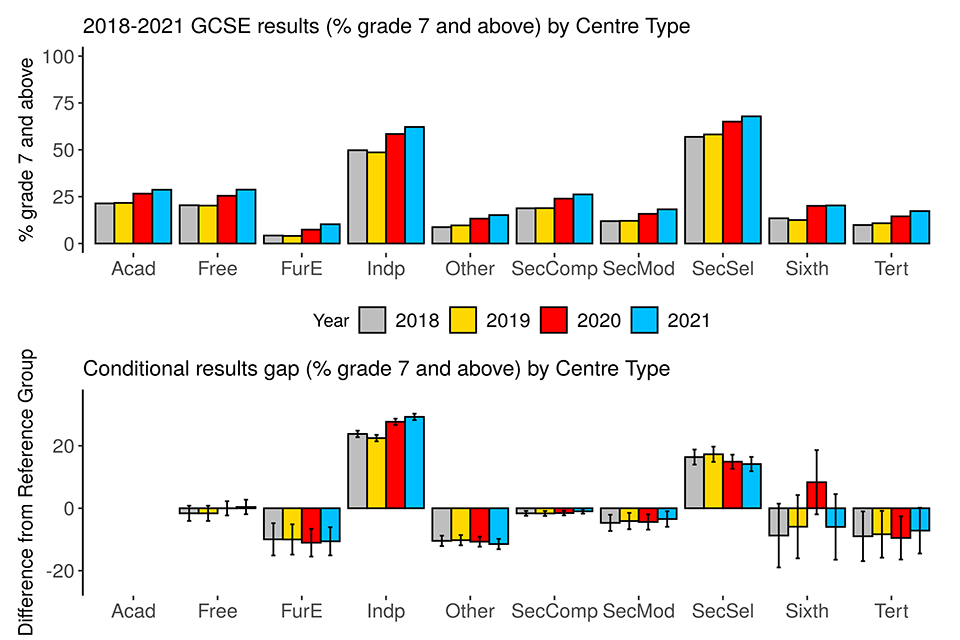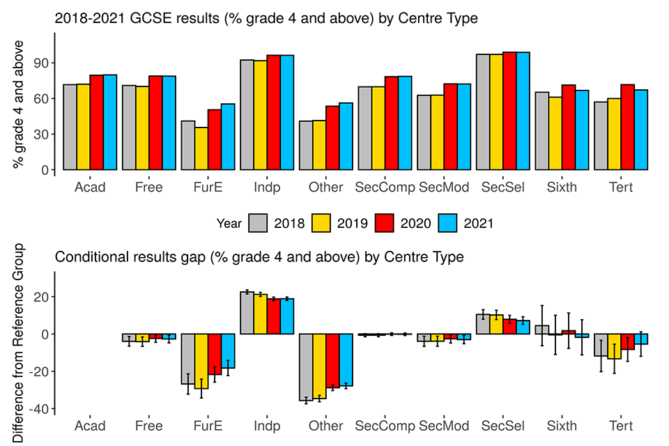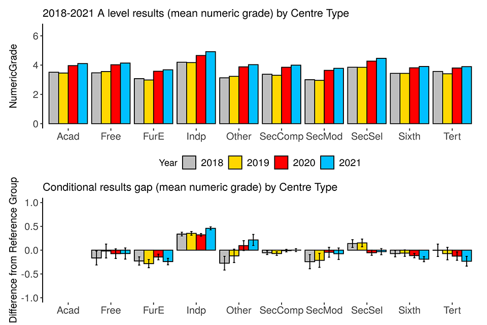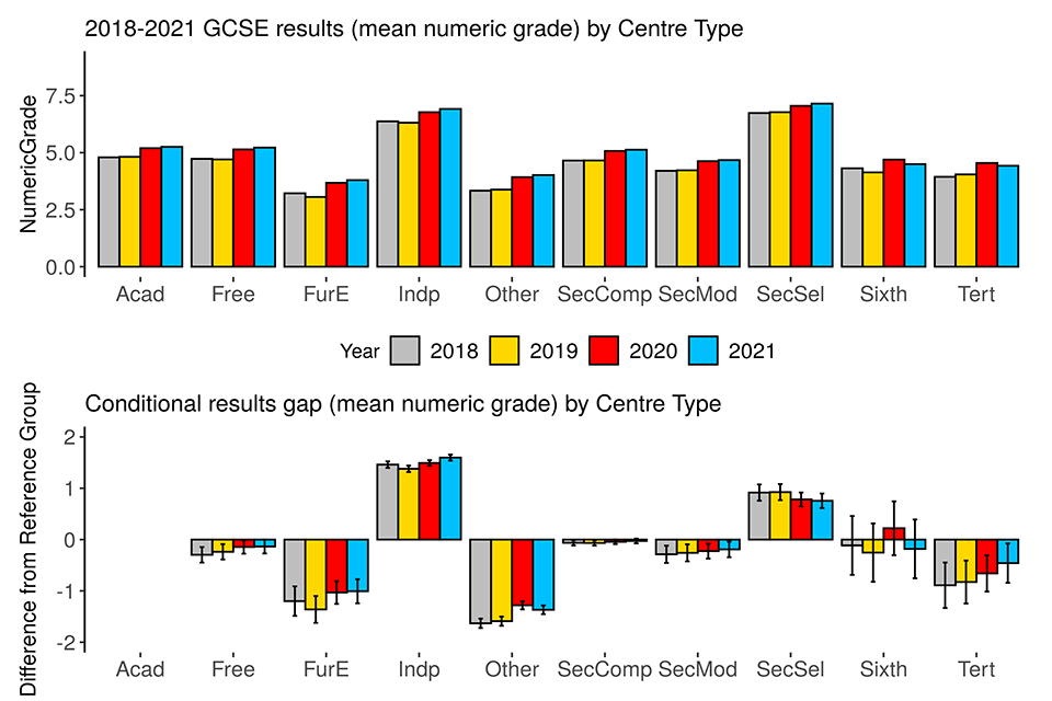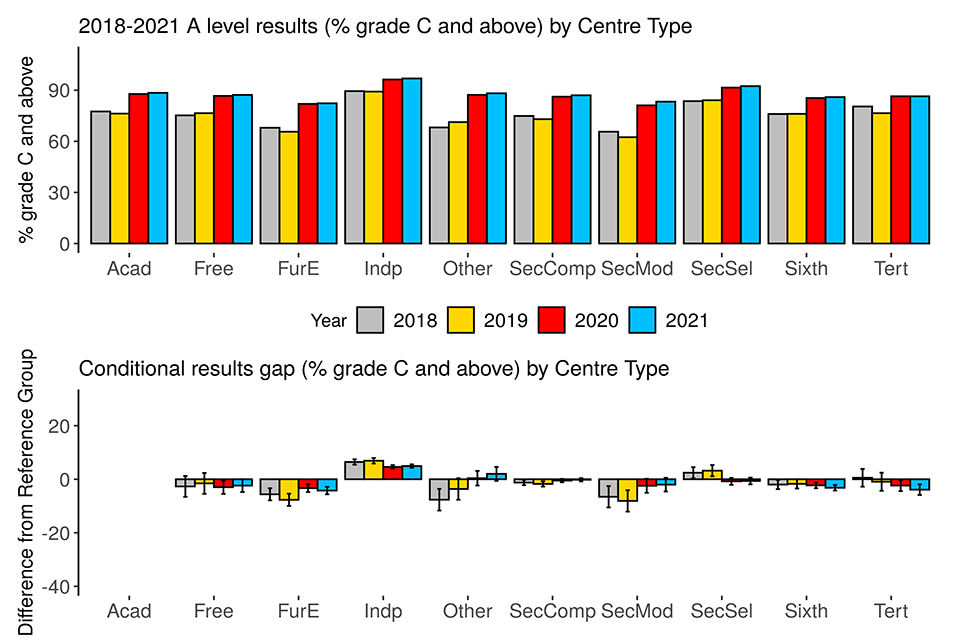 Candidates in ‘other’ centre types (a category which incorporates institutions such as tutorial colleges, language schools, special schools, pupil referral units and training centres), have seen, from 2019 to 2021, an increase in outcomes (a change of 0.33 grade) relative to prior-attainment-matched candidates of the comparator group, namely, academies.