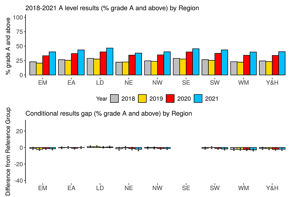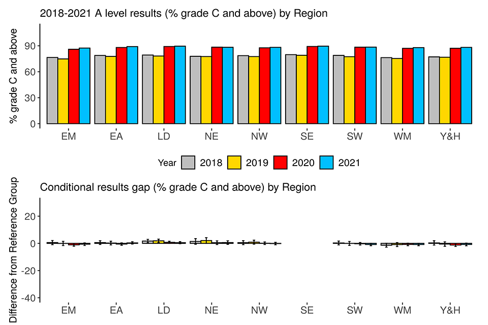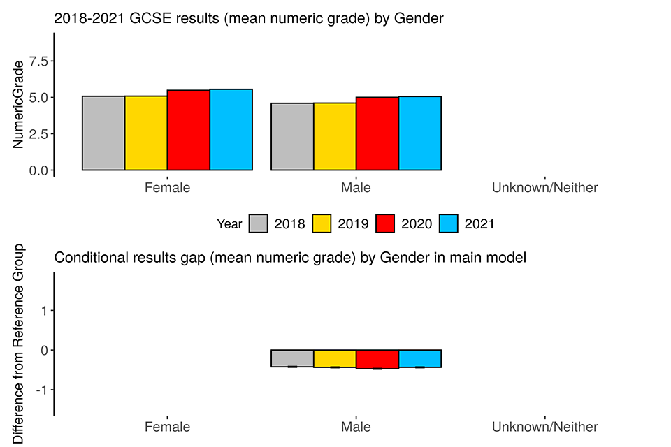 Conditional results gaps in 2018 and 2019 tell us that differences in exam results existed in pre-pandemic times and that conditional results gaps can vary from year to year even in normal times. By comparing changes in conditional results gaps between 2021 and 2019 and those between 2021 and 2020 against changes in conditional results gaps between 2019 and 2018, we identified the ‘notable’ changes between 2020 and 2021 and those between 2019 and 2021. (In this paper, the use of the word ‘notable’ is specific to our method of evaluating between-year changes in group differences. It does not convey any judgement of the importance or not of the change in question.)