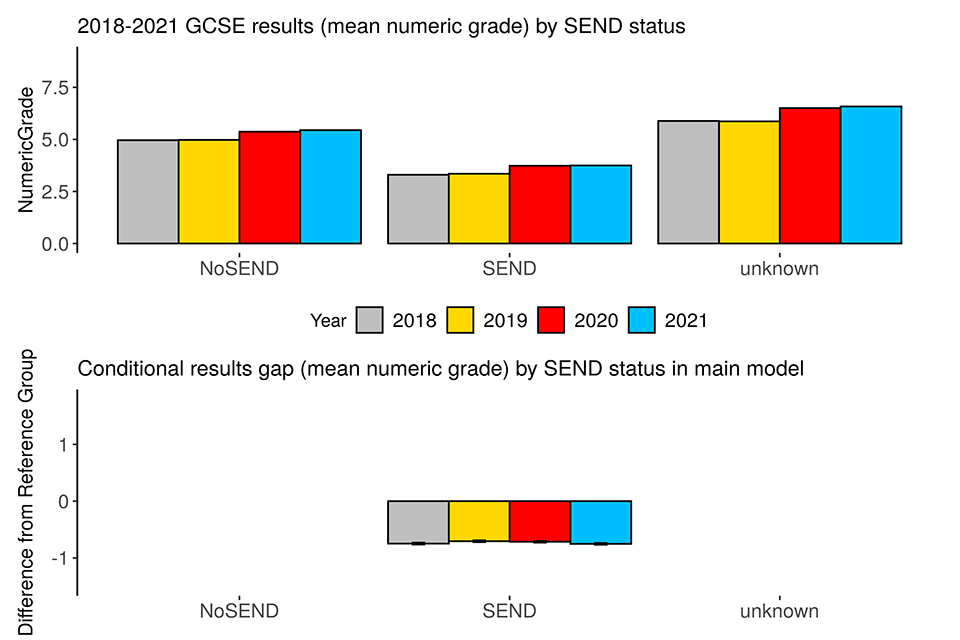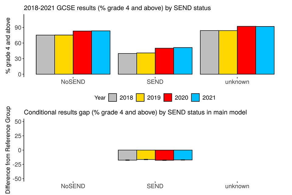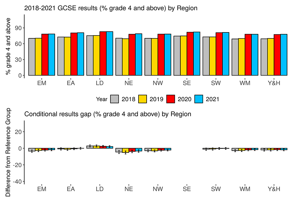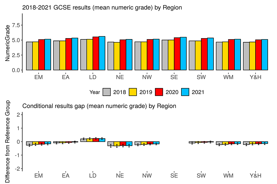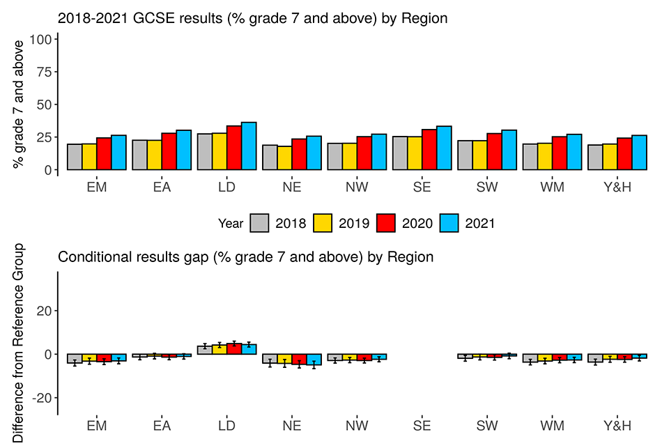 This paper presents an analysis of the relationships between GCSE and A level results of summer 2018 to 2021 on the one hand, and protected characteristics and other student background variables, on the other. We analysed 3 results measures: mean numeric grade, probability of grade A or 7 and above, and probability of grade C or 4 and above. We used multilevel regression modelling to estimate ‘conditional results gaps’, that is, results gaps for subgroups of students defined by various variables, relative to their respective comparator group (which was the largest group under the respective variable), after controlling for other variables, including prior attainment. Conditional results gaps in 2018 and 2019 tell us that differences in exam results existed in pre-pandemic times and that conditional results gaps can vary from year to year even in normal times. By comparing changes in conditional results gaps between 2021 and 2020 and those between 2021 and 2019 against changes in conditional results gaps between 2019 and 2018, we identified the notable changes between 2020 and 2021 and those between 2019 and 2021. (In this paper, the use of the word ‘notable’ is specific to our method of evaluating between-year changes in group differences. It does not convey any judgement of the importance or not of the change in question.)