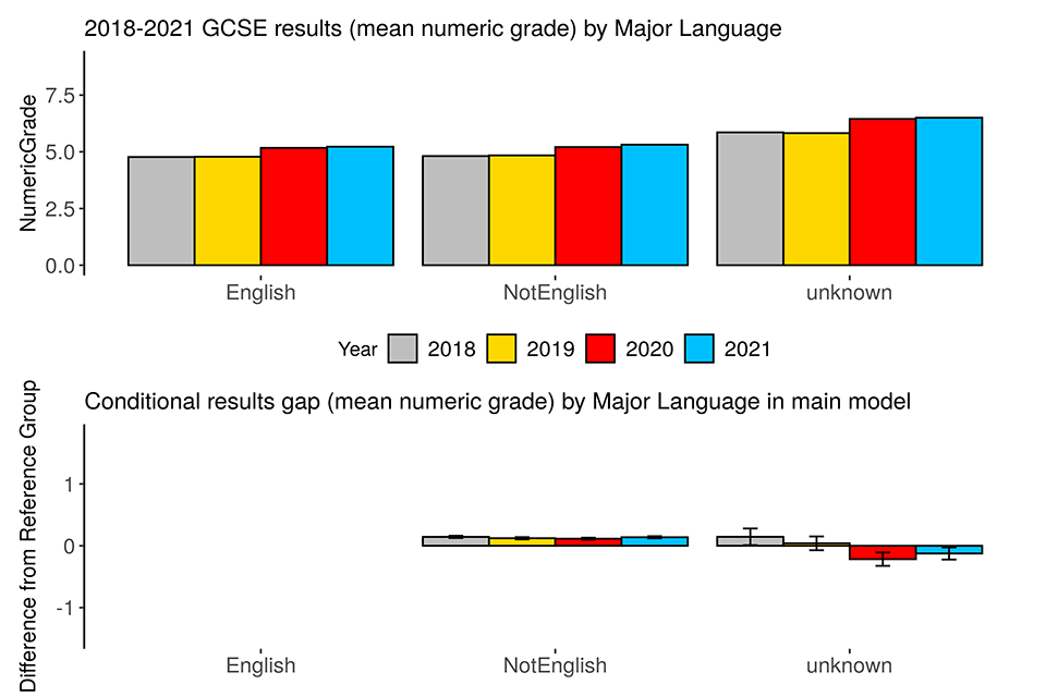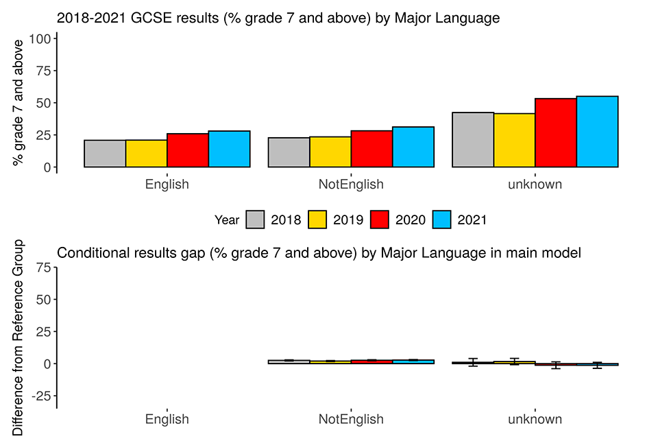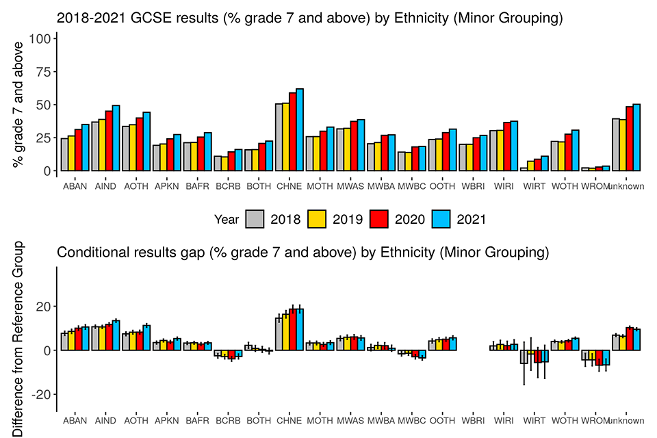 Figure 17 shows a breakdown of 2018-2021 GCSE results (on the probability-of-grade-7-and-above measure) by narrow grouping of ethnicity, and the modelled conditional results gaps between the groups defined under the variable and the reference group (White British). Table 21 presents the additional models’ results gap estimates for 2018-2021.