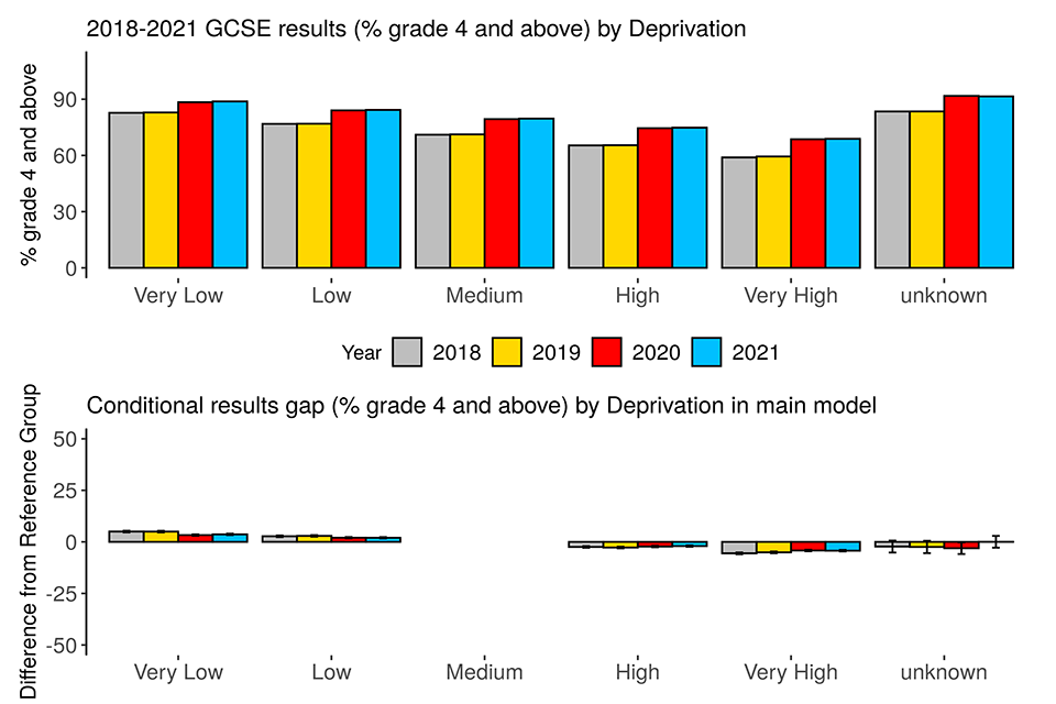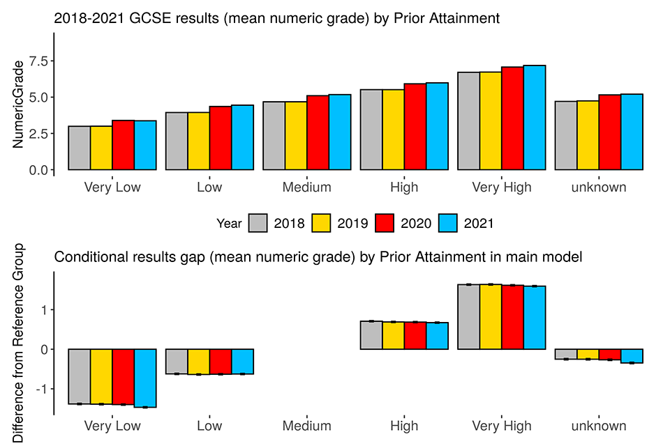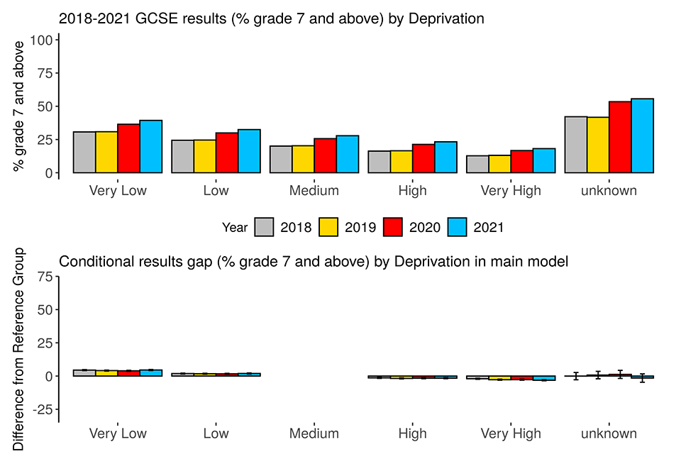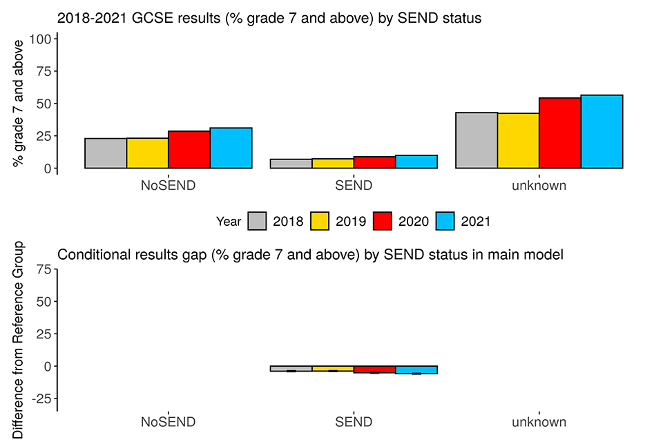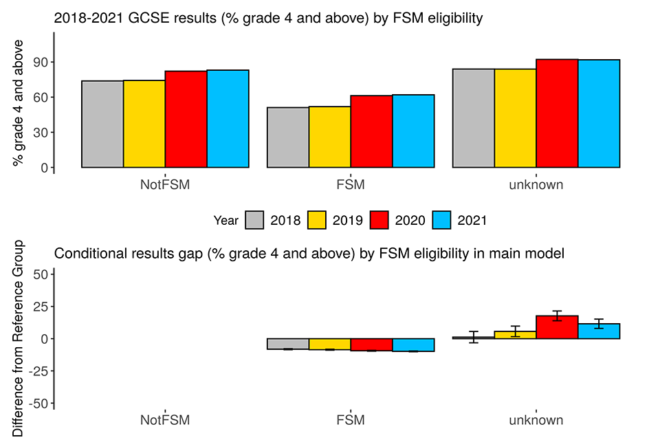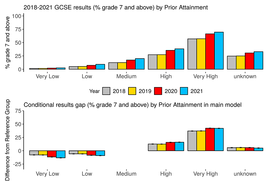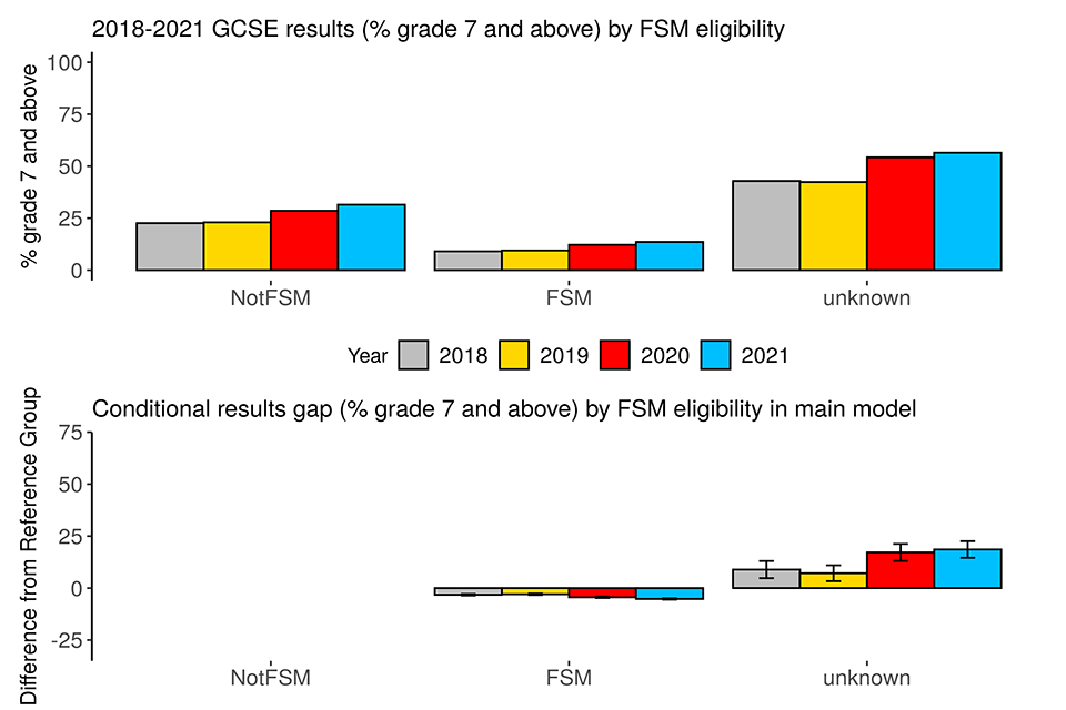 Candidates with unknown ethnicity, candidates with unknown FSM status, and candidates in tertiary colleges, have seen, from 2019 to 2021, an increase in outcomes (changes not exceeding 0.5 grade) relative to prior-attainment-matched candidates of their respective comparator group, namely, White British candidates, candidates not eligible for FSMs, and candidates in academies respectively. Candidates in independent schools have seen, from 2019 to 2021, an increase in outcomes on the numeric grade (a change of 0.22 grade) and grade-7-and-above measures, but a decrease on the grade-4-and-above measure, relative to prior-attainment-matched candidates of the comparator group, namely, academies.