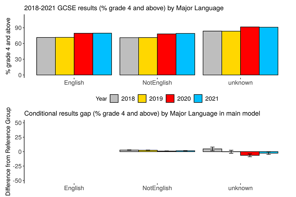 Figure 18 shows a breakdown of 2018-2021 GCSE results (on the probability-of-grade-4-and-above measure) by narrow grouping of ethnicity, and the modelled conditional results gaps between the groups defined under the variable and the reference group (White British). Table 22 presents the additional models’ results gap estimates for 2018 to 2021.