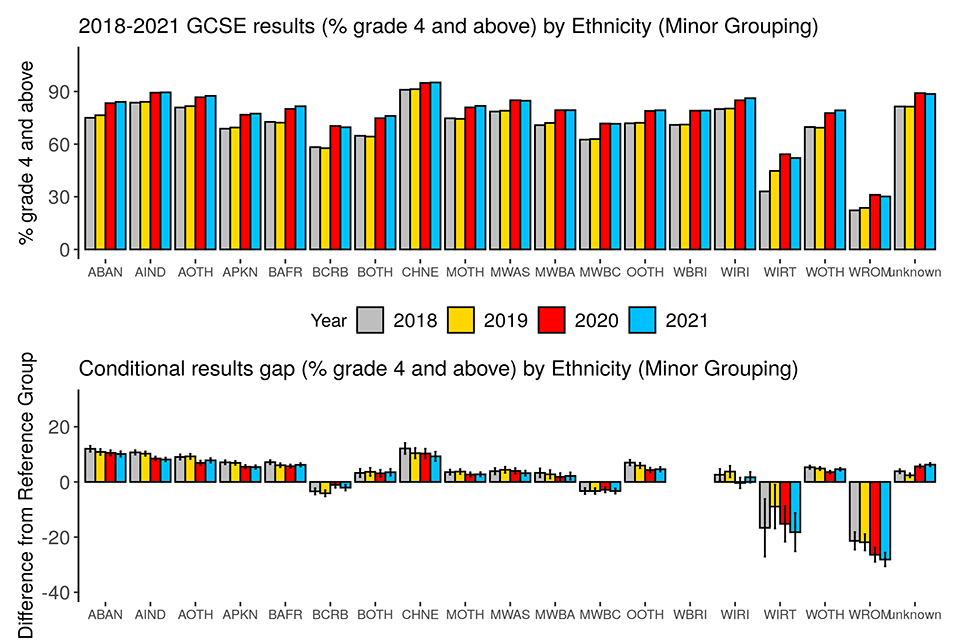 - the gaps indicating lower outcomes of Mixed White and Black Caribbean candidates and Gypsy and Roma candidates, relative to prior-attainment-matched White British candidates, have widened by 2.13 and 2.29 percentage points