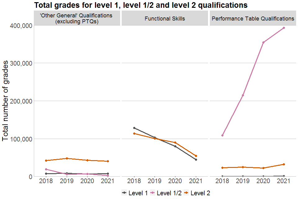 Line chart showing total grades awarded for Level 1, Level 1/2 and Level 2 'Other General', Functional Skills and Performance Table qualifications in 2018, 2019, 2020 and 2021