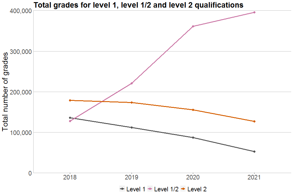 Overall, as shown in Figure 4, the total number of grades issued for Level 1 and Level 2 qualifications has steadily decreased over time. For Level 1/2 qualifications, there has been an increase over the past 4 years, with the difference between 2020 and 2021 being smaller than before.