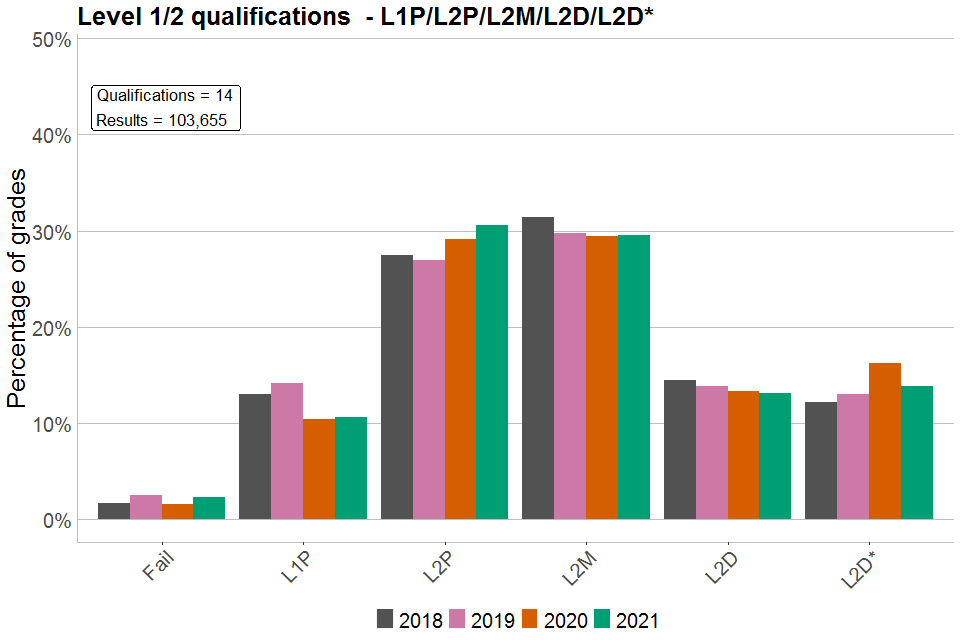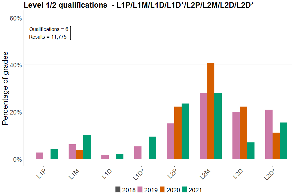 Bar chart showing percentages of each grade awarded in Level 1/2 qualifications graded L1P/L1M/L1D/L1D*/L2P/L2M/L2D/L2D*