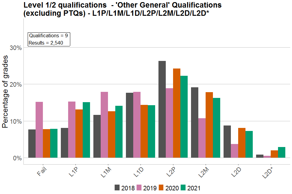 Bar chart showing percentages of each grade awarded in Level 1/2 'Other General' qualifications