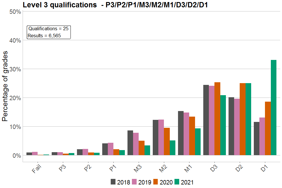 Bar chart showing percentages of each grade awarded in Level 3 VTQs graded P3/P2/P1/M3/M2/M1/D3/D2/D1