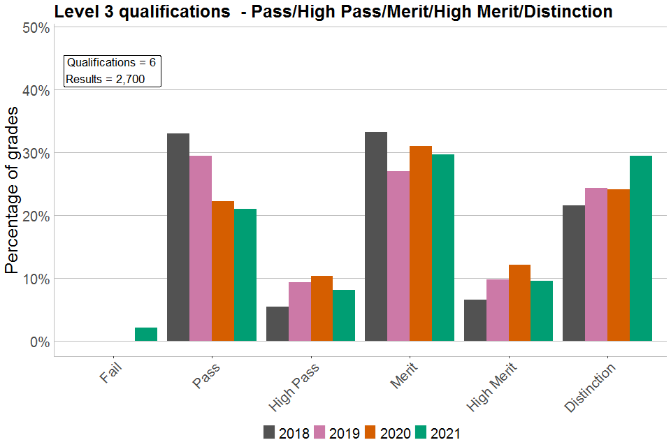 AOs were asked to provide to Ofqual the qualification-level grades awarded to all learners in centres in England who took or would have taken assessments for these qualifications between 24 March 2021 and 31 July 2021. This period of time was chosen to be consistent with data collected for previous years (which was based on the period covered by the Extraordinary Regulatory Framework (ERF). Where grades had not been fully finalised at the point of data submission, provisional grades were accepted for the purpose of these analyses. Fail grades have been reported where they were provided to us by AOs. However, it should be noted that not all AOs were able to report fail grades to us as part of this data collection. Results should be interpreted with that in mind.