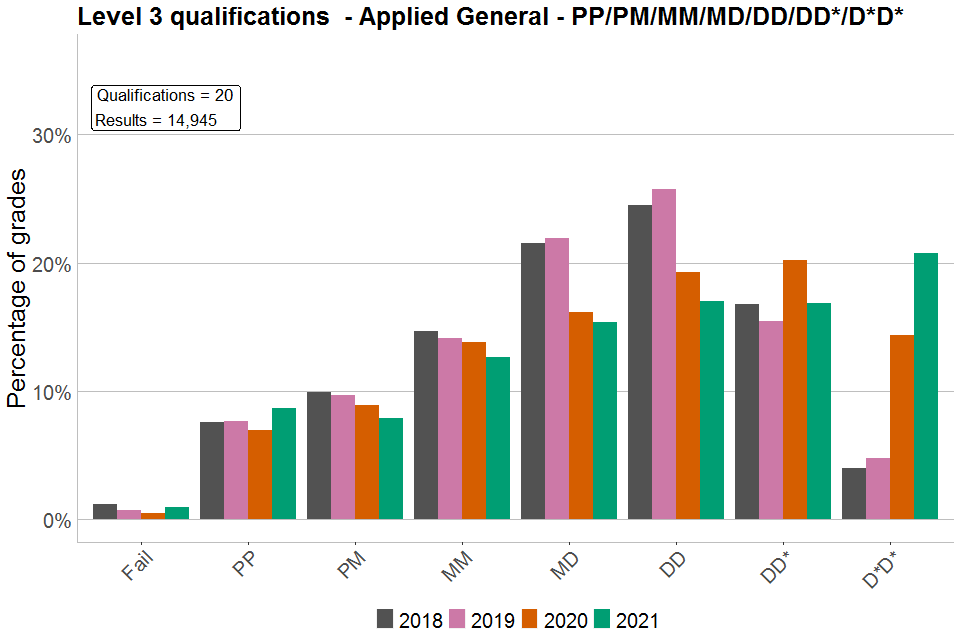 Bar chart showing percentages of each grade awarded in Level 3 Applied General qualifications graded P/M/D/D*