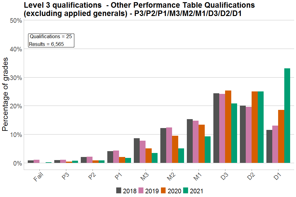 When focussing on the proportions of top grades being issued, the patterns of changes are mixed, with some qualification groupings seeing a decrease in proportions and others seeing an increase. This makes it difficult to draw any overarching conclusions for VTQs as a single group, instead reflecting the overall diversity of the market. One group of Level 3 Performance Table qualifications (with the grade scale P3 to D1) saw a large increase in the proportion of top grades being awarded this year compared to last (from 18.5% in 2020 to 33.1% in 2021). Another group (with the grade scale P/M/D) saw an increase from 21% in 2020 to 38% in 2021. However, these qualifications made up a relatively small proportion of the overall entry size at Level 3.