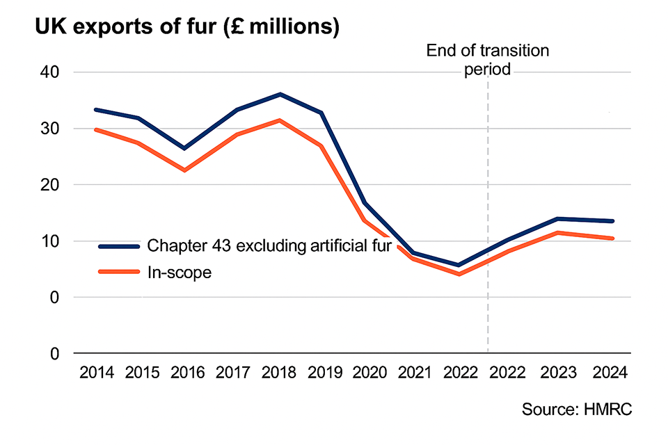 The UK exports considerably less fur by volume under chapter 43 than it imports. Average export volumes of all chapter 43 fur (excluding artificial fur) were considerably less in the period 2020 to 2022 (see chart below). Although there was some recovery in 2023 and 2024, levels remain below the period 2014 to 2019. Average exports of all chapter 43 fur (excluding artificial fur) fell by value from £36 million from 2017 to 2019 to £16 million in 2021 to 2023. The value of exports has not recovered in 2023 to 2024 to the same extent as volume.