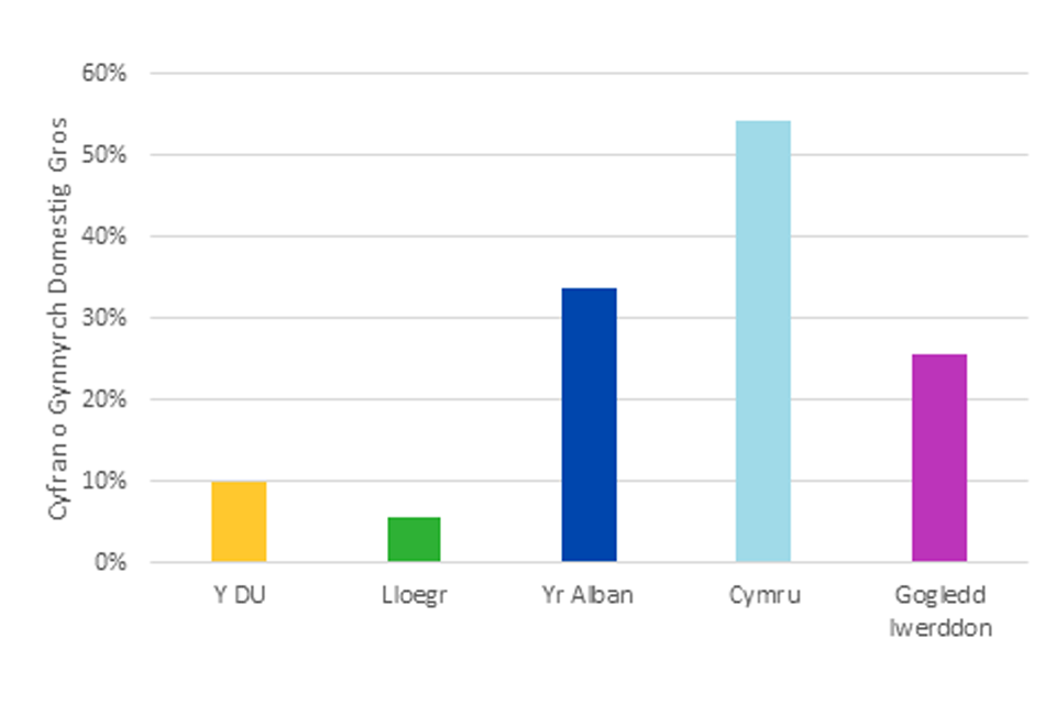 Mae set ddata’r Ganolfan Ragoriaeth Ystadegau Economaidd (ESCoE) ar gyfer 2015 (a gyhoeddwyd 2021) yn dal i fod yr amcangyfrif mwyaf diweddar o fasnach oddi mewn i’r DU sy’n cynnwys ffigyrau ar gyfer Lloegr. Mae ESCoE yn amcangyfrif bod gwerthiannau oddi mewn i’r DU wedi dod i gyfanswm o tua £190 biliwn. Yn Ffigur 2.1, dangosir yr amrywiaeth ym mhwysigrwydd masnach economaidd o ran cyfran y Cynnyrch Domestig Gros a gynrychiolir gan fasnach oddi mewn i’r DU. Gan ddefnyddio data ESCoE 2015 ac amcangyfrifon y Cynnyrch Domestig Gros ar gyfer 2015,[troednodyn 10] roedd gwerthiannau oddi mewn i’r DU yn cynrychioli tua 10% o gyfanswm Cynnyrch Domestig Gros y DU.[troednodyn 11] O gymharu â hyn, roedd gwerthiannau Lloegr oddi mewn i’r DU yn cynrychioli dim ond 6% o Gynnyrch Domestig Gros Lloegr; roedd gwerthiannau’r Alban oddi mewn i’r DU yn 34% o Gynnyrch Domestig Gros yr Alban; o ran Cymru, mae gwerthiannau oddi mewn i’r DU yn cyfrif am 54% o’i Chynnyrch Domestig Gros; ac roedd gwerthiannau Gogledd Iwerddon oddi mewn i’r DU yn cynrychioli 26% o Gynnyrch Domestig Gros Gogledd Iwerddon.[troednodyn 12] Fel y nodwyd uchod, disgwyliwn y bydd y set ddata newydd ar gyfer masnach oddi mewn i’r DU (sydd i fod i gael ei chyhoeddi yn hydref 2024) yn darparu diweddariad ar yr amcangyfrif o £190 biliwn.