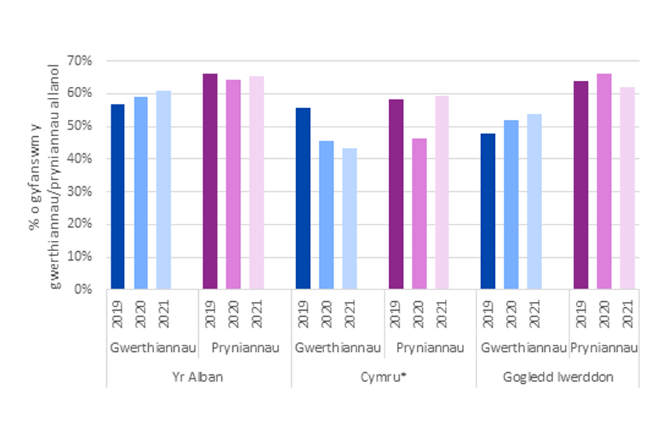 Graff bar yn dangos cyfran gwerth masnach oddi mewn i’r DU fel cyfran o gyfanswm pryniannau/gwerthiannau allanol ar gyfer yr Alban, Cymru, a Gogledd Iwerddon ar gyfer 2019 i 2021.