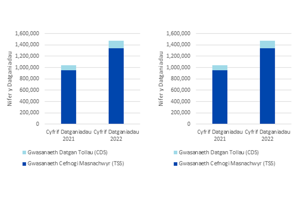 Yn adroddiad eleni, defnyddiwn ddata ychwanegol gan BICS a CThEF i gael gwell dealltwriaeth o lifau masnach rhwng Prydain Fawr a Gogledd Iwerddon. Mae data BICS yn awgrymu bod cyfartaledd o 4.5% o fusnesau wedi dweud eu bod wedi anfon nwyddau o Brydain Fawr i Ogledd Iwerddon yn y 12 mis diwethaf. Er mai dim ond cyfran fechan yw hon o’r holl fusnesau, roedd gwerth y fasnach a oedd yn rhan o hyn yn fwy sylweddol; yn 2021, roedd gwerth y datganiadau tollau a oedd yn gysylltiedig â’r llifau masnach hyn yn cynrychioli tua 24% o Gynnyrch Domestig Gros Iwerddon. Dengys data BICS hefyd bod llai na 2% o fusnesau wedi anfon nwyddau o Ogledd Iwerddon i Brydain Fawr yn y 12 mis diwethaf.