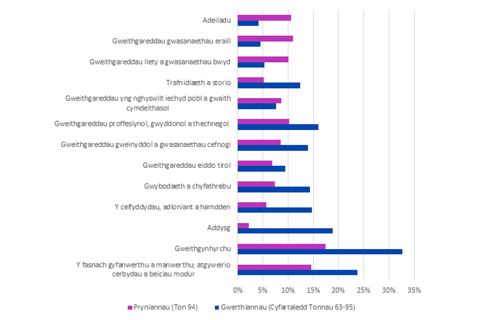 Yn y cyd-destun hwn mae ‘cyfanswm y gyflogaeth yn y sector nwyddau’ yn cyfeirio at adrannau A-C a F SIC ↩