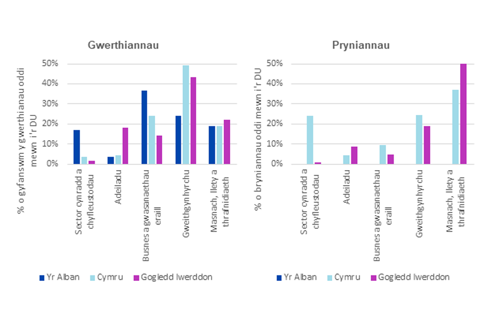 busnesau o fewn y sectorau gweithgynhyrchu, cyfanwerthu a manwerthu sy’n fwyaf tebygol o fasnachu oddi mewn i’r DU. Yng Nghymru a Gogledd Iwerddon, mae busnesau ym maes gweithgynhyrchu yn cyfrif am y gyfran fwyaf o werth gwerthiannau oddi mewn i’r DU, ond yn yr Alban, busnesau sy’n cyflenwi ar gyfer busnesau a gwasanaethau eraill sy’n cyfrif am y gyfran fwyaf o’r gwerth hwn