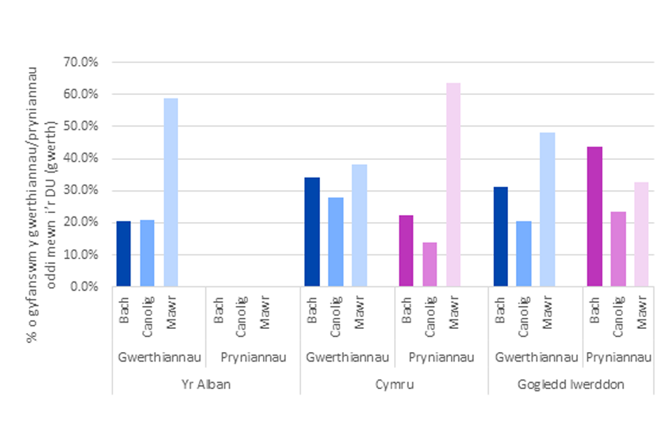roedd gwerth y masnachu oddi mewn i’r DU, fel cyfran o gyfanswm gwerthiannau/pryniannau bob gwlad, yn gyffelyb ar y cyfan ar gyfer Cymru, yr Alban a Gogledd Iwerddon, gan amrywio o 43 i 61% ar gyfer gwerthiannau a 59 i 65% ar gyfer pryniannau yn 2021 (gweler Ffigur 2.5). Mae’r gyfran o welliannau allanol drwy fasnachu oddi mewn i’r DU yn sylweddol uwch ar gyfer bob un o’r gwledydd hyn na’r ffigwr ar gyfer y DU yn ei chyfanrwydd yn 2015 (27%), sy’n awgrymu bod gwledydd y tu hwnt i’r DU yn cyfrif am gyfran llawer uwch o werthiannau Lloegr na’r gwledydd eraill oddi mewn i’r DU