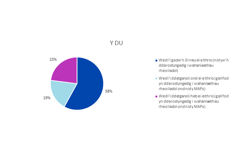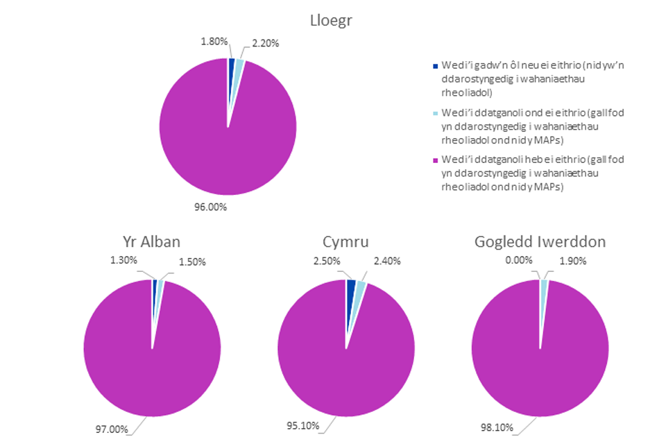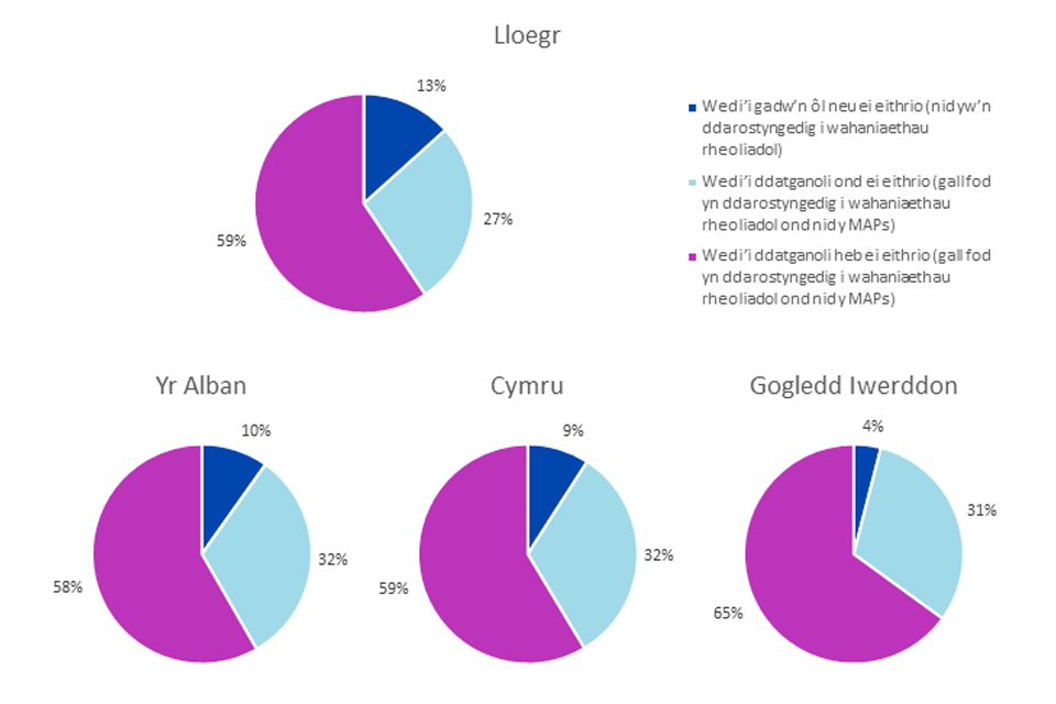 Mae cyfeiriadau at faterion ‘a gedwir yn ôl’ yn cynnwys materion eithriedig yng Ngogledd Iwerddon. Ond dylid nodi y gallai Llywodraeth y DU ymwahanu Prydain Fawr o reoliadau’r UE ar gyfer nwyddau o fewn materion eithriedig a gynhwysir o fewn Fframwaith Windsor, gan felly greu gwahaniaethau rheoliadol o fewn y DU. ↩