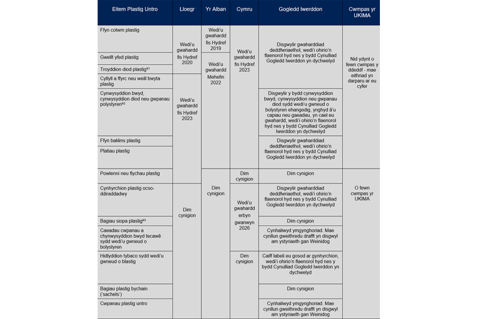Roedd gwaharddiad cynharach Llywodraeth y DU yn cynnwys cyflenwi gwellt yfed, troyddion diod a ffyn cotwm o blastig untro. ↩