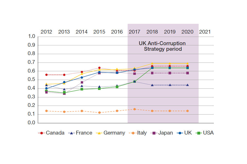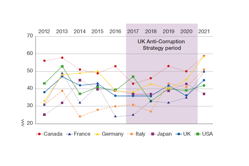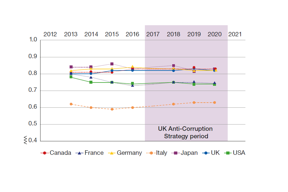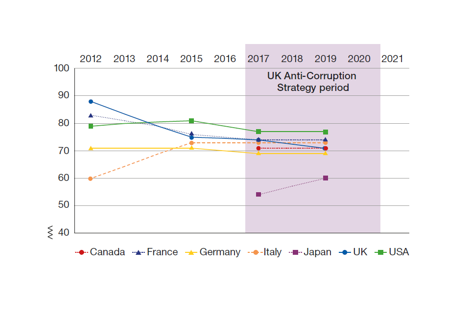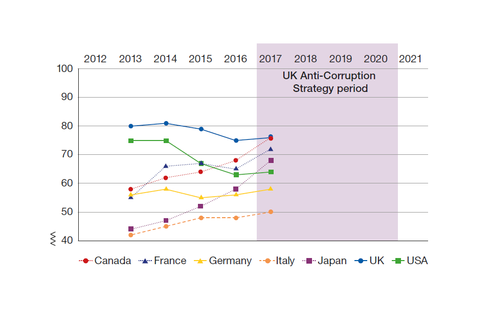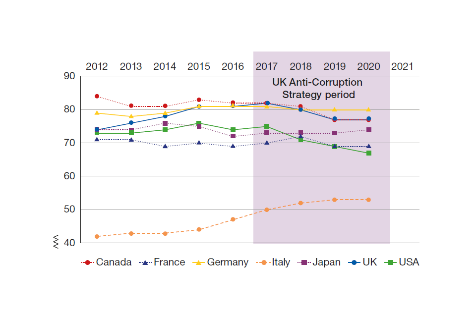 In the Year 2 Update we introduced a new section looking at how the UK’s standing on corruption has changed throughout the Strategy period. While necessarily imperfect, these indicators give a broad indication of how the UK is performing on anti‑corruption indices. As we observed last year, this is not an easy task. Corruption is a broad topic, covering multiple areas and factors where measuring against statistics is challenging.