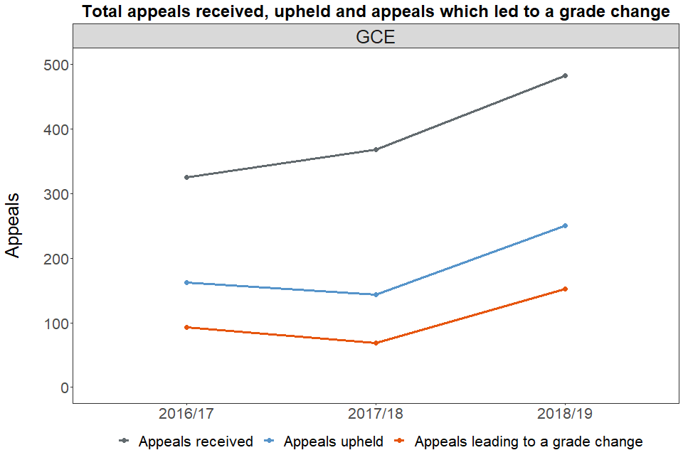 | Year | Appeals received (GCE) | Appeals upheld (GCE) | Appeals leading to a grade change (GCE) | Proportion of appeals upheld (GCE) |