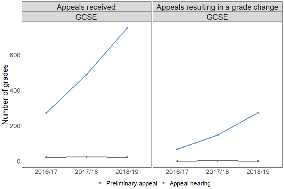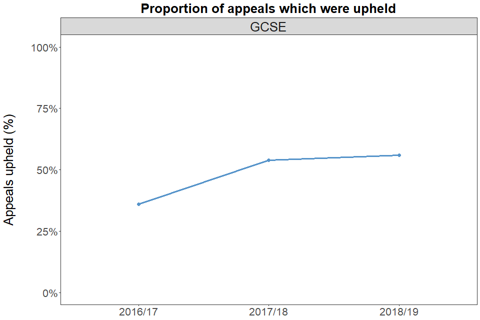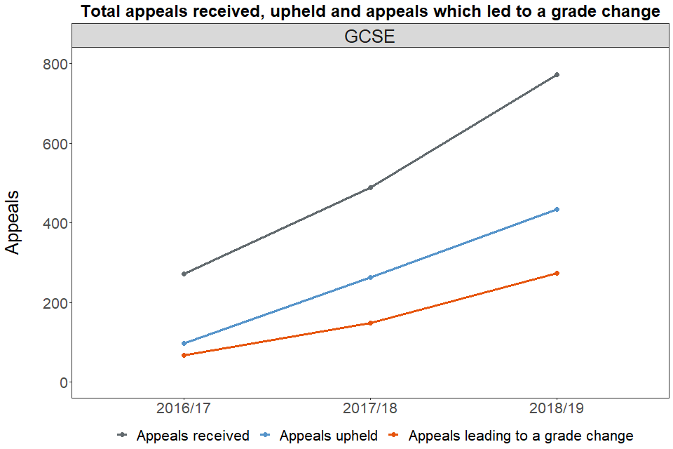 | Year | Appeals received (GCSE) | Appeals upheld (GCSE) | Appeals leading to a grade change (GCSE) | Proportion of appeals upheld (GCSE) |
