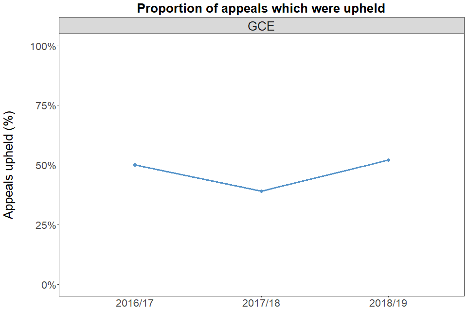 The number of GCE appeals increased from 368 in 2017/18 to 482 in 2018/19 (an increase of 31%). Additionally, the number of appeals which were upheld increased from 143 in 2017/18 to 250 in 2018/19 (an increase of 75%) and the number of appeals which led to a grade change increased from 69 in 2017/18 to 152 in 2018/19 (an increase of 120%). The proportion of GCE appeals which were upheld this year (52%) has increased, having previously decreased in 2017/18.