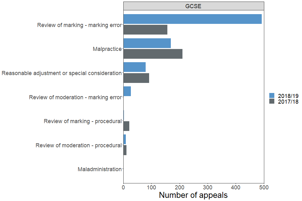 In 2018/19, new grounds for appeal to be considered under these arrangements (that schools and colleges can appeal on the basis that there was a marking or moderation error) were introduced for all GCSE subjects, resulting in a marked increase in the number of appeals received in these subjects.