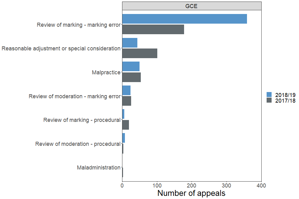 For GCE in 2018/19, the largest category for appeals was ‘review of