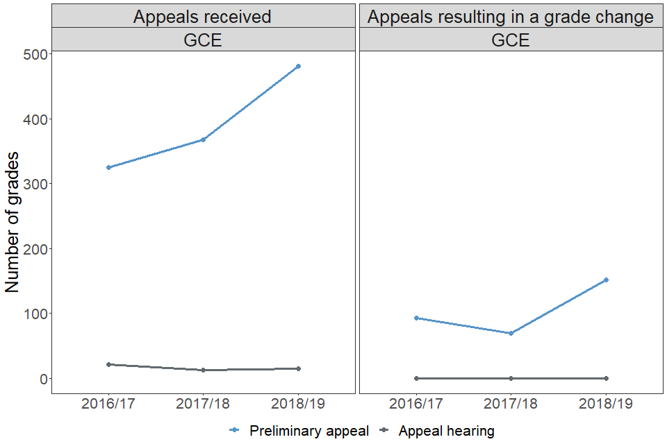 | Year | Appeals received - preliminary appeal (GCE) | Appeals received - appeal hearing (GCE) | Appeals resulting in a grade change - preliminary appeal (GCE) | Appeals resulting in a grade change - appeal hearing (GCE) |