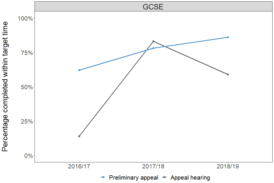 | Year | Stage of appeal | Appeals received (GCSE) | Number of appeals completed in target time (GCSE) | Percentage of appeals completed in target time (GCSE) |
