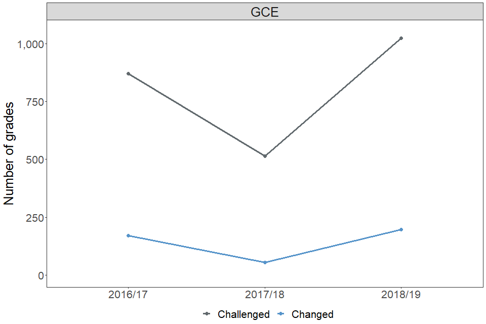 | Year | Grades challenged (GCE) | Grades changed (GCE) |