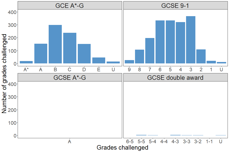 For GCE qualifications, grade B was the most contested grade. For GCSE qualifications, grade 3 was the most contested grade and there were fewer than 5 GCSE alphabetical grades challenged.