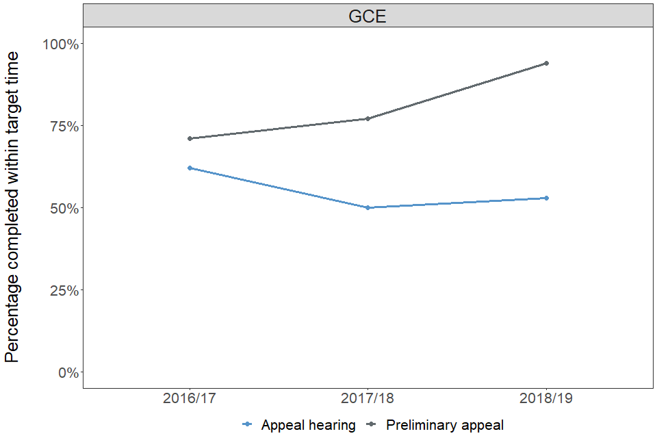 | Year | Stage of appeal | Appeals received (GCE) | Number of appeals completed in target time (GCE) | Percentage of appeals completed in target time (GCE) |