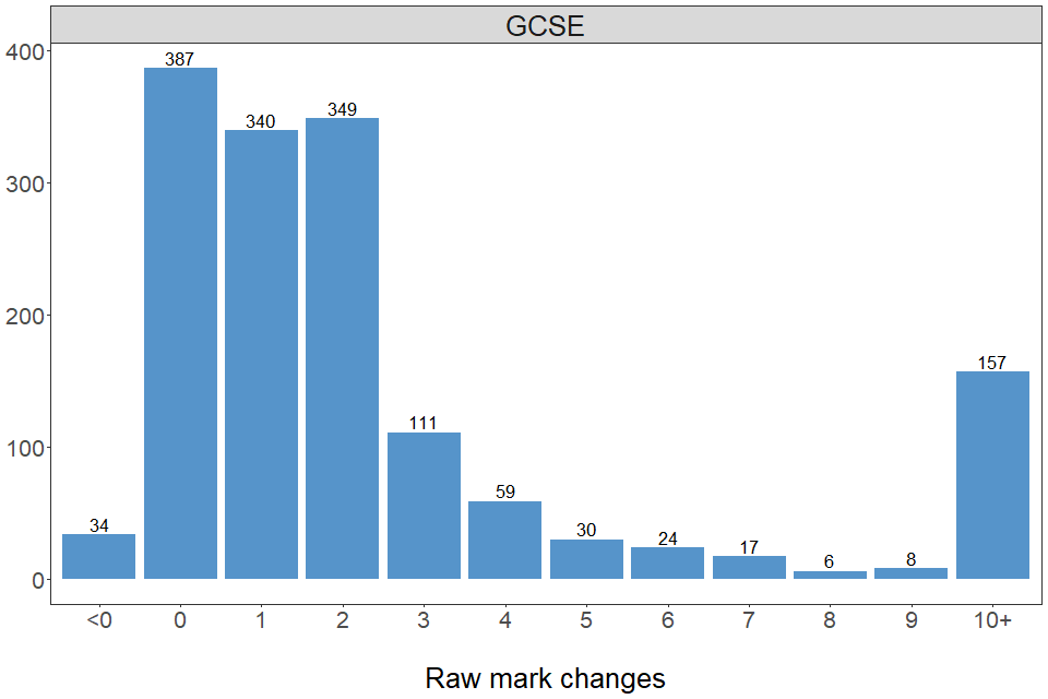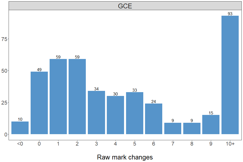 Note that all mark changes of 10 marks or more have been combined into a single category in the charts given below (shown as 10+). A change of 10 marks or more may reflect an overturned malpractice decision where the candidate was originally given 0 marks due to alleged malpractice.