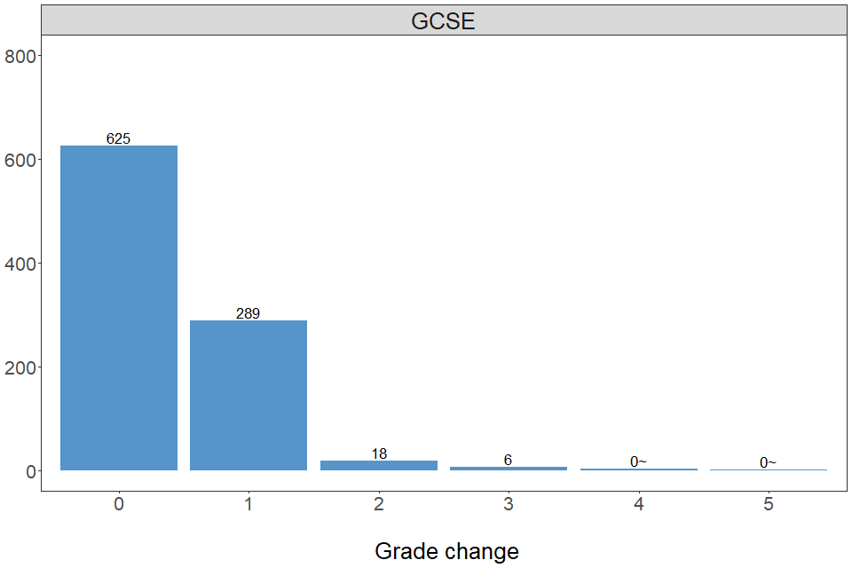 Overall, 66% of grades challenged in upheld appeals for GCSE did not result in a qualification grade change in 2018/19. Of the grades that changed, 91% changed by one grade and 9% resulted in a change of 2 or more grades.