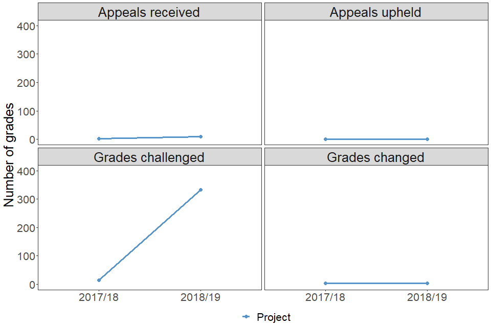 The number of appeals received for Project qualifications increased from fewer than 5 in 2017/18 to 9 in 2018/19. The number of grades challenged increased from 14 to 333. The number of appeals upheld stayed the same and the number of grades changed stayed the same.