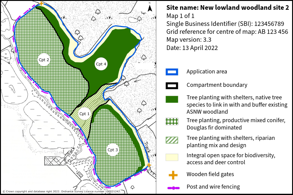This example map includes the different types of tree planting, labelled compartment boundaries and required information, such as the site name, central grid reference and SBI number.