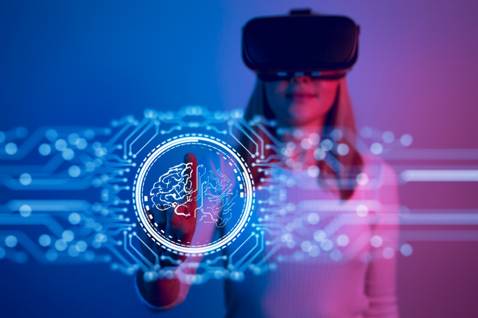 Woman in a VR headset pointing to a virtual touch screen (credit: Vertigo3d / iStock)