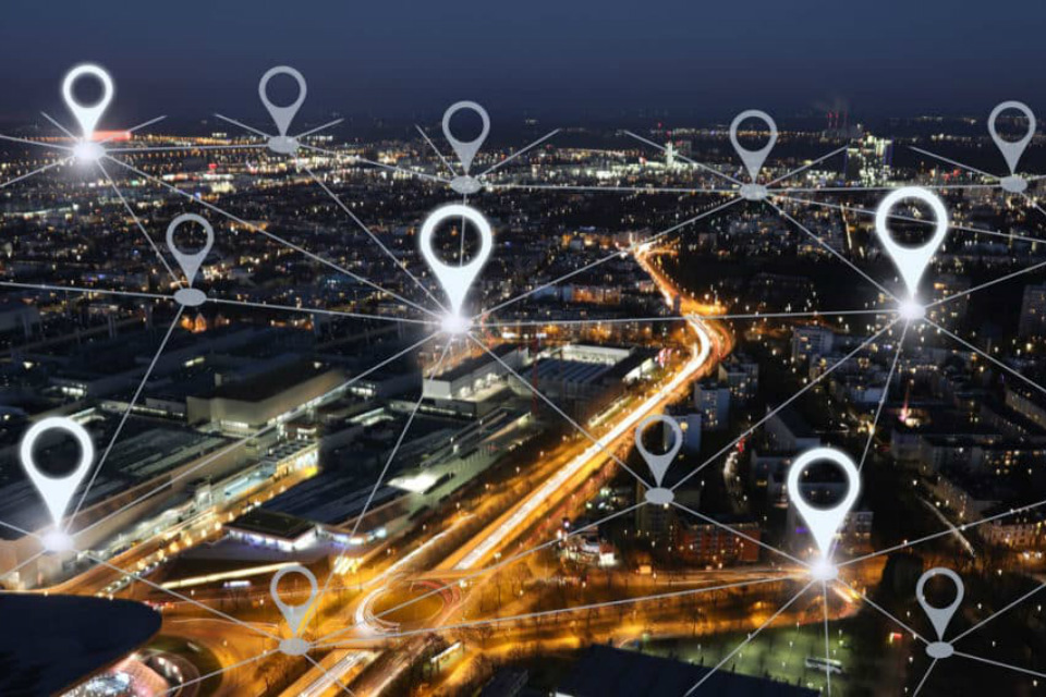 View of a city at night overlayed with location markers (Credit: alexsl / iStock)