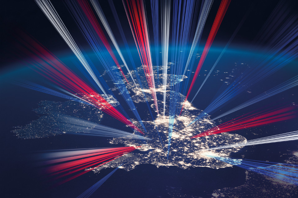 Illustration of the UK at night with red, white and blue lasers (detail of the Industrial Strategy front cover).