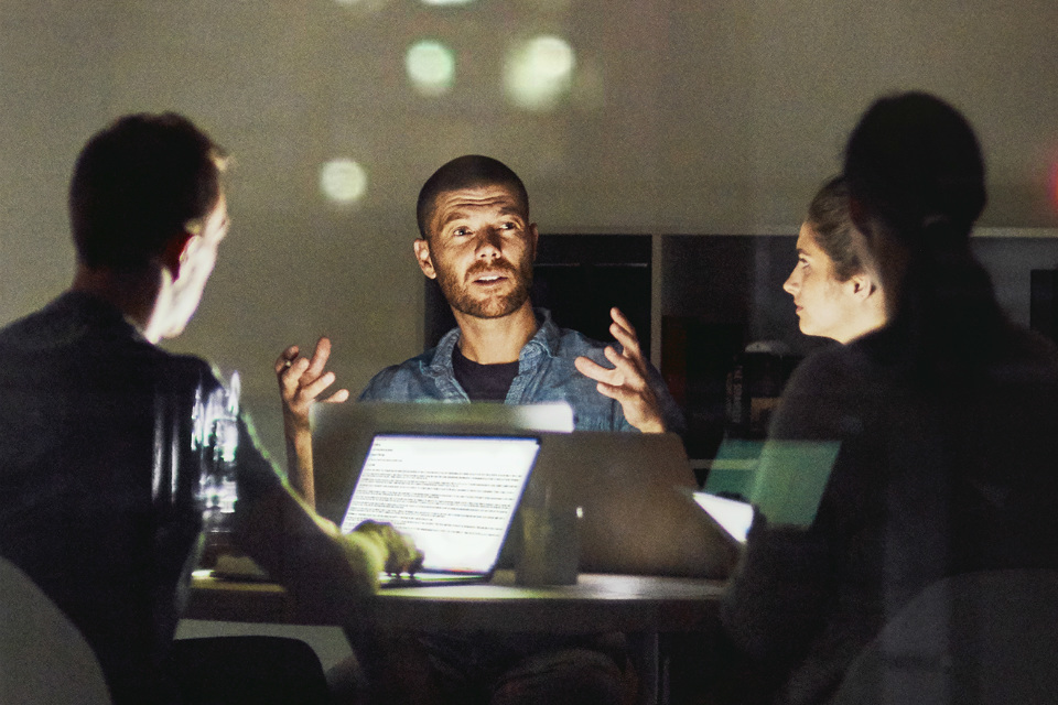 A business meeting at night illuminated by a laptop (credit: Cecilie_Arcurs / iStock)