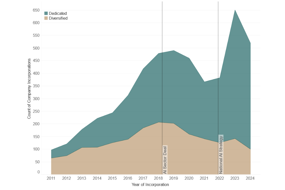 Artificial Intelligence activity in the UK is not defined by a formal Standard Industrial Classification (SIC) code[footnote 8]. This study therefore uses experimental methods to identify and quantify AI activity across traditional economic sectors. The approach and methodology are consistent with those employed to produce analyses of the UK cyber security sector annually since 2018, and with the method used to create baseline evidence regarding the AI sector in 2022 and 2023[footnote 9]. The data used to inform the study includes: