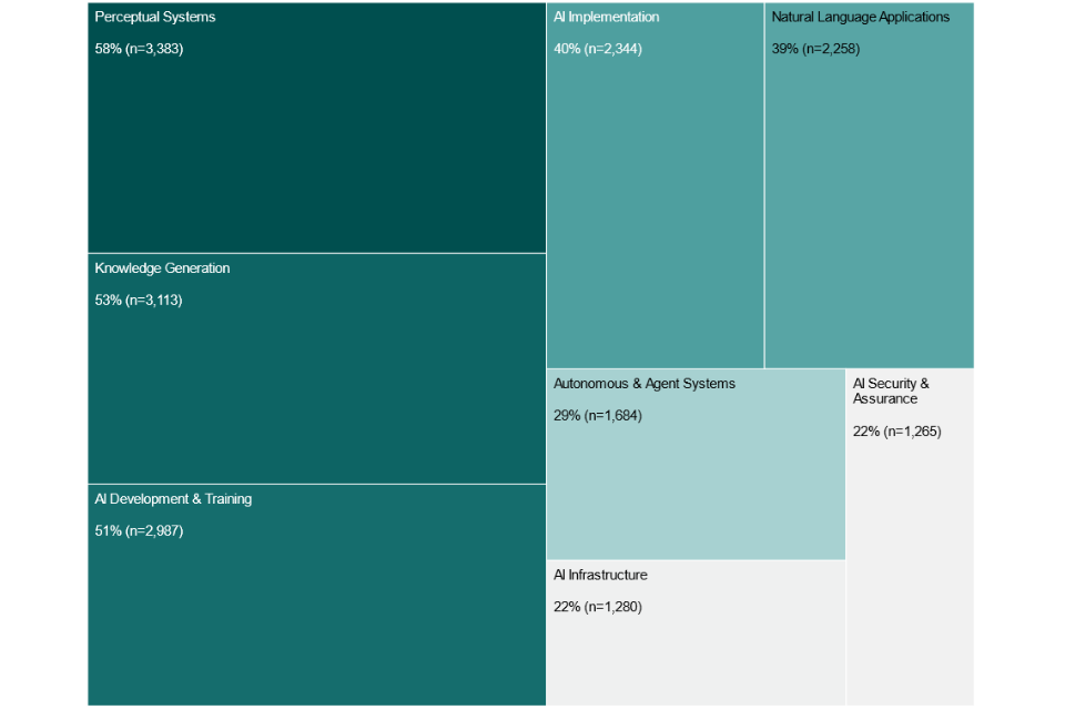 While London and the South East still account for a majority of AI activity, the doubling of AI companies in regions such as the West Midlands, North West and Yorkshire and the Humber demonstrates substantive uptake of AI related opportunities across regions.