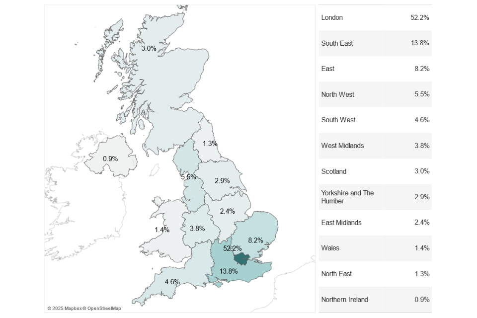 In 2024, London, the South East and the East of England still account for approximately 75% of registered office locations. However, the number of AI firms across other UK regions has been increasing year-on-year at annual growth rates of between 20% and 50%.