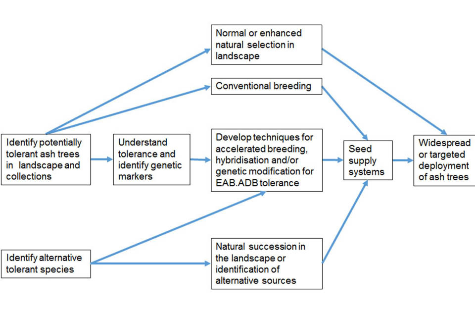 Figure 2: Flowchart showing the steps between identifying potentially tolerant or alternative tolerant ash tree species and widespread or targeted deployment of ash trees to aid recovery